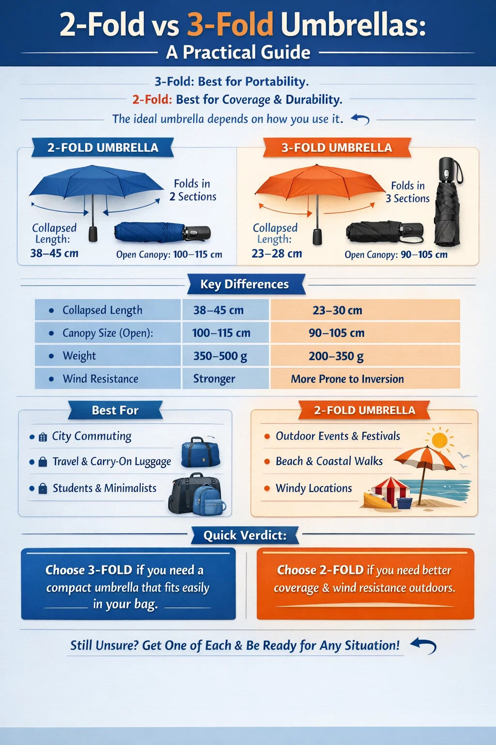Si umbella opus est ad cotidianam commutandam, officium utendum, vel iter, ubi spatium sacculi strictum est; a III-ovili umbella fere semper in melius colligunt . Decidit ad fere 23-28 cm, convenit in sinum iaccam vel parvam marsupium, et satis leve est ad portandum sine animadversione. Si, contra, multum temporis foris versas — sive ad litus, stadium sive regionem pulchram tendis — umbella 2-ovili tibi dat conspicue ampliorem conopeum, fortiorem corpus, et melioris venti resistentiam, cum grandiores ad portandum.