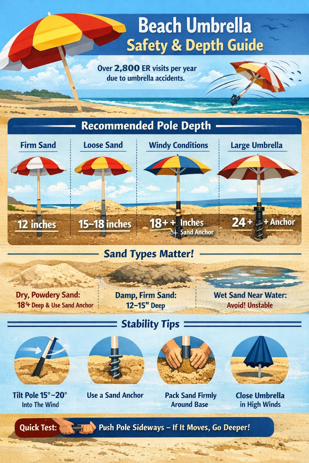 Litore umbellae polus in arenam inseri debet saltem 12 pollices (30 cm) — et specimen 18 digitorum (45 cm) vel altius resolutum, siccum, vel pulverulentam arenam. Id baseline refero. Altitudinem accuratam quam necesse est ex arena generis, celeritatis vento, diametro poli, et an arena ancora uteris. Nimis vadosum et litus tuum umbella periculum proiectum fit; nimis profunde et perdis conatum qui in propriam angorem provenire potuit.