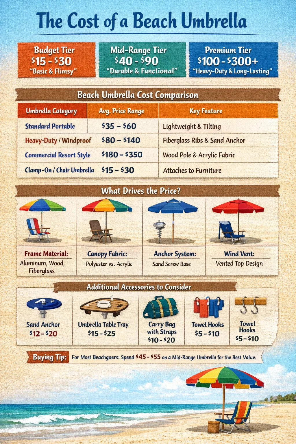 Si ad litus tendis, signum, certum litus umbrella typice constat inter $ XXXV et $ LXXV " . Hoc bracket pretium plerumque exempla operit cum conopeo 6-ad-7-pedum, mechanismo inclinato fundamentali, et tunica UV argenteo iactata. Sed lata est forum; potes invenire ingressum-level "disponi" umbellas apud locales boardwalk tabernas quam minimum $15 ad $25 , dum summus finis , commercialis gradus umbrae structurae ad sustinendum ventum gravem pretium pervenire potest $ CL ad $ CCC vel plures .