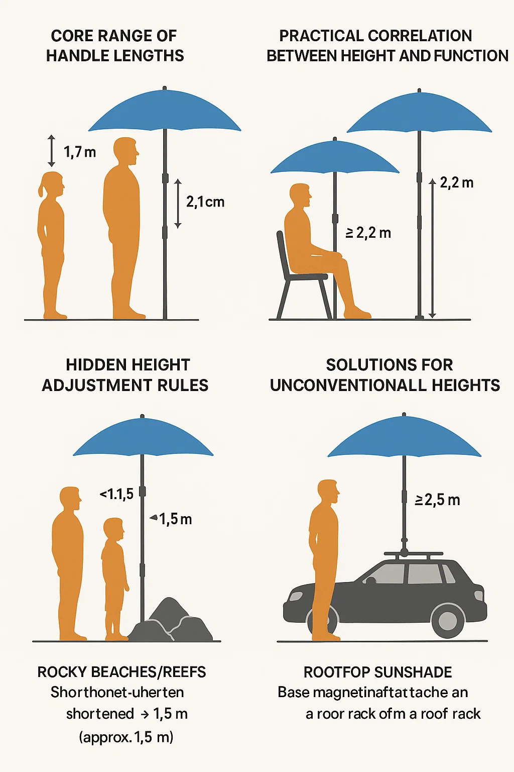 Short Umbrellas (≤1.8 metris): Disposito sol protege dum sedens. Alleluia altitudo aequet backrest de litus cathedra (70-80 cm), ensuring quod caput est patere solem cum stans.