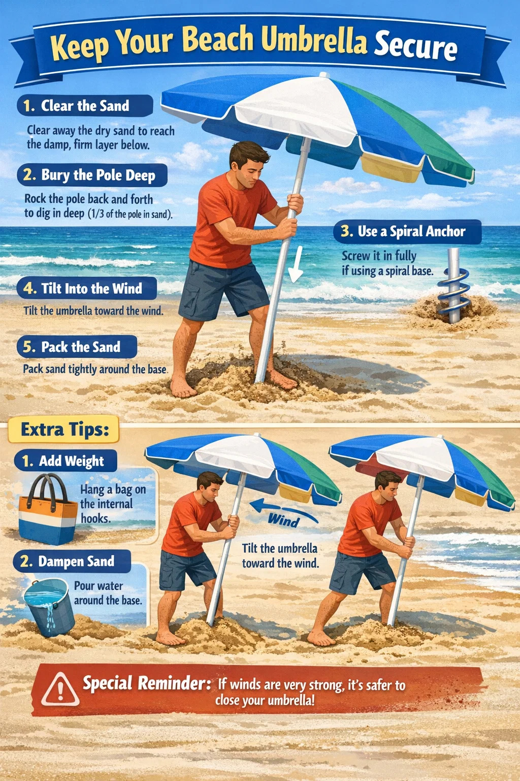 Ut tua litus umbella In aura maris stabilis manet et non inflatur, paucae strophae institutionum cruciantur. Sequentes hae gradus signanter periculum umbellae tuae a vento abrepti redigunt;