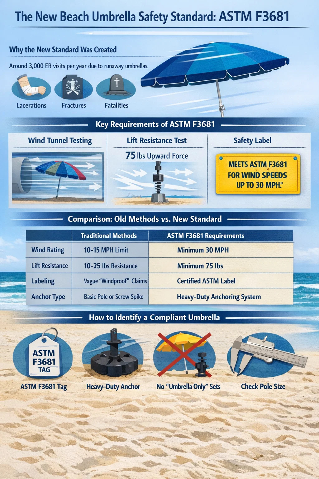 The umbella novum litus vexillum est ASTM F3681-24 (ad F3681-25) quae ponit primam officialem observantiam ad resistendum et ancoras ventum requisita. Sub hoc indice novo, vexillum litus umbella cum diametro pede 7.5-esse poterit sustinere venti celeritates usque ad XXX milia per hora (MPH) non decet aerium. Accedit, ratio ancoraria saltem praebere debet LXXV libras resistendi contra sursus attollere vires, ut in arenis firmiter insita consistat.